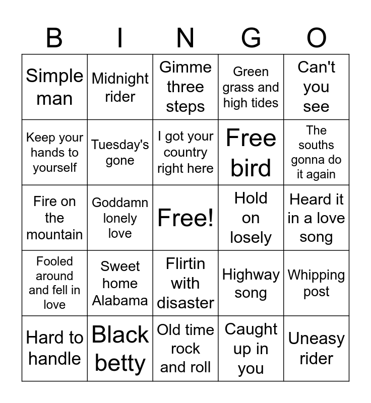 This bingo card has a free space and 24 words: Sweet home Alabama, Black betty, I got your country right here, Hard to handle, Can't you see, Simple man, Keep your hands to yourself, Midnight rider, Hold on losely, Flirtin with disaster, Free bird, Fire on the mountain, Highway song, Whipping post, Tuesday's gone, Caught up in you, Heard it in a love song, Gimme three steps, The souths gonna do it again, Goddamn lonely love, Uneasy rider, Fooled around and fell in love, Green grass and high tides and Old time rock and roll.