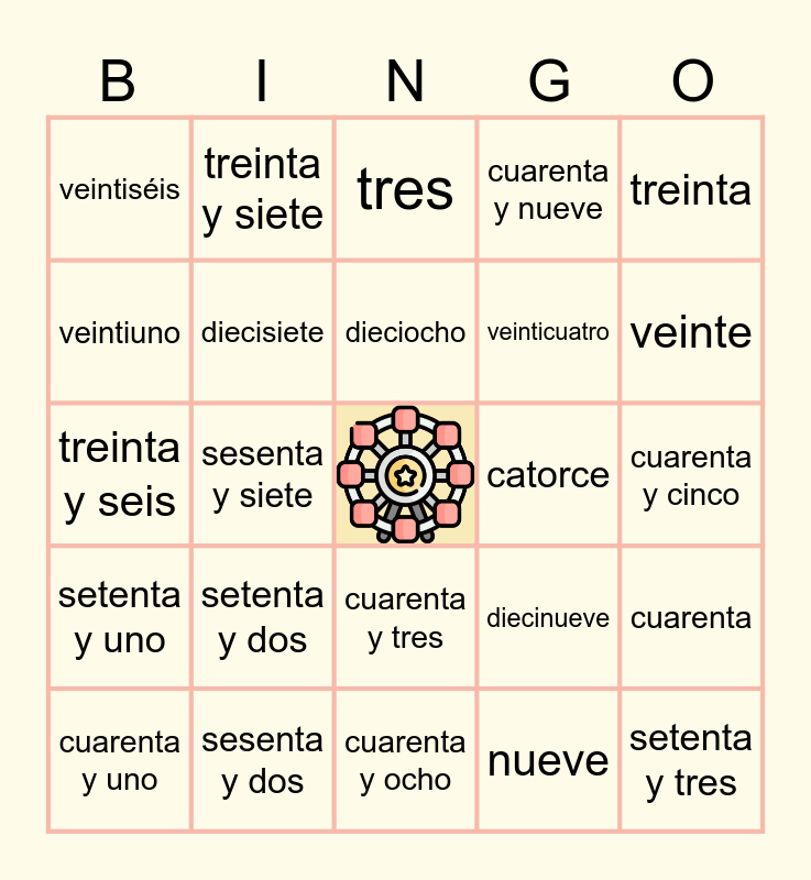 This bingo card has a free space and 75 words: uno, dos, tres, cuatro, diez, seis, siete, ocho, nueve, quince, once, doce, catorce, veinte, dieciséis, diecisiete, trece, diecinueve, veinticinco, veintiuno, veintidós, dieciocho, veinticuatro, treinta, veintiséis, veintisiete, veintitrés, veintinueve, treinta y cinco, treinta y uno, treinta y dos, veintiocho, treinta y cuatro, cuarenta, treinta y seis, treinta y siete, treinta y tres, treinta y nueve, cuarenta y cinco, cuarenta y uno, cuarenta y dos, treinta y ocho, cuarenta y cuatro, cincuenta, cuarenta y seis, cuarenta y siete, cuarenta y tres, cuarenta y nueve, cincuenta y cinco, cincuenta y uno, cincuenta y dos, cuarenta y ocho, cincuenta y cuatro, sesenta, cincuenta y seis, cincuenta y siete, cincuenta y tres, cincuenta y nueve, sesenta y cinco, sesenta y uno, sesenta y dos, cincuenta y ocho, sesenta y cuatro, setenta, sesenta y seis, sesenta y siete, sesenta y tres, sesenta y nueve, setenta y cinco, setenta y uno, setenta y dos, sesenta y ocho, setenta y cuatro, setenta y tres and cinco.