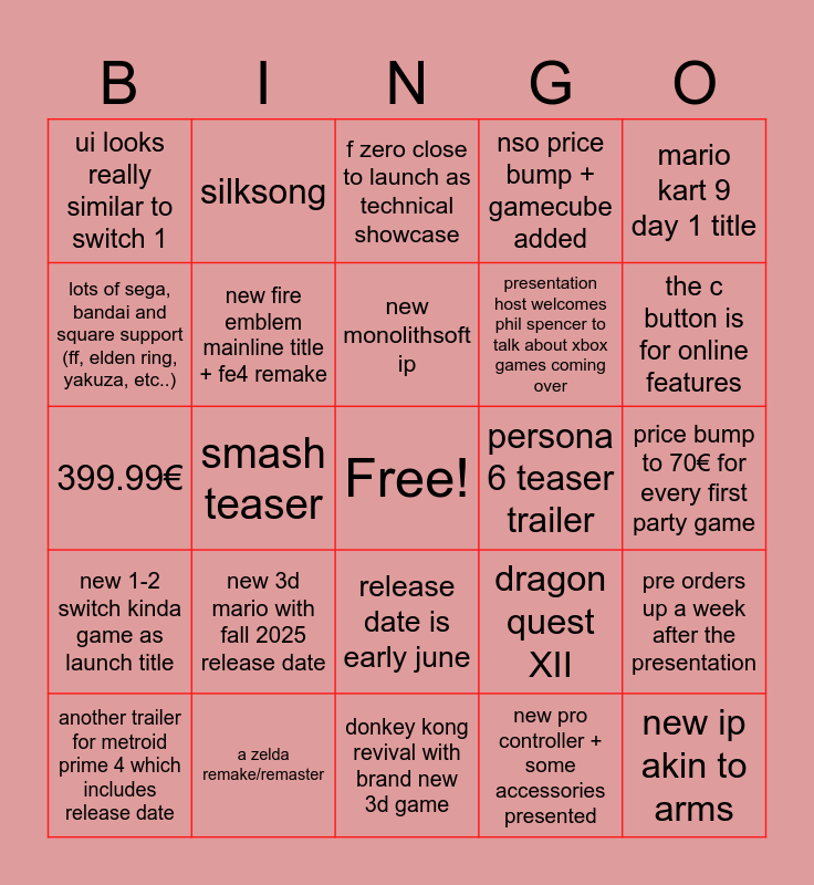 This bingo card has a free space and 24 words: new 3d mario with fall 2025 release date, a zelda remake/remaster, new monolithsoft ip, another trailer for metroid prime 4 which includes release date, mario kart 9 day 1 title, ui looks really similar to switch 1, lots of sega, bandai and square support (ff, elden ring, yakuza, etc..), silksong, persona 6 teaser trailer, release date is early june, presentation host welcomes phil spencer to talk about xbox games coming over, 399.99€, dragon quest XII, pre orders up a week after the presentation, new fire emblem mainline title + fe4 remake, new pro controller + some accessories presented, price bump to 70€ for every first party game, f zero close to launch as technical showcase, the c button is for online features, smash teaser, new ip akin to arms, new 1-2 switch kinda game as launch title, nso price bump + gamecube added and donkey kong revival with brand new 3d game.