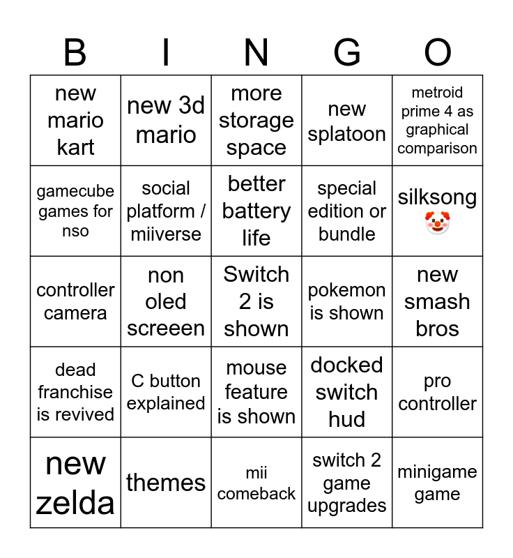 This bingo card has a free space and 24 words: C button explained, themes, better battery life, new zelda, metroid prime 4 as graphical comparison, new mario kart, gamecube games for nso, new 3d mario, pokemon is shown, mouse feature is shown, special edition or bundle, controller camera, docked switch hud, pro controller, social platform / miiverse, switch 2 game upgrades, new smash bros, more storage space, silksong 🤡, non oled screeen, minigame game, dead franchise is revived, new splatoon and mii comeback.