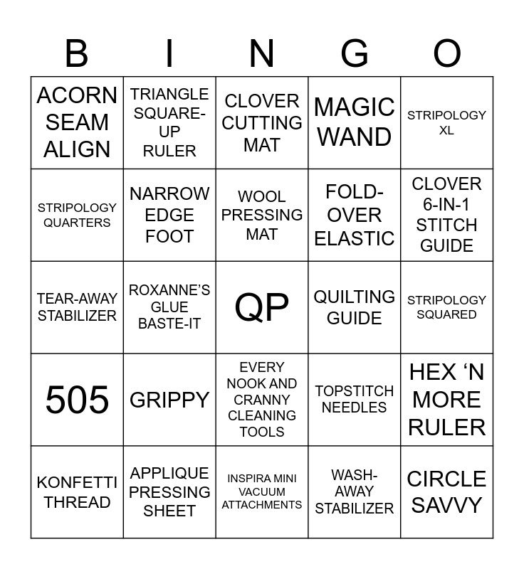 This bingo card has a free space and 65 words: BEST PRESS MISTER BOTTLE, FORK PINS, BEST PRESS, HEX ‘N MORE RULER, MICROTEX NEEDLES, FRIXION PEN, TRIANGLE SQUARE-UP RULER, FABRIC FOLDING PEN, WOOL PRESSING MAT, WOOL PRESSING MAT CLEANING TOOL, EVERY NOOK AND CRANNY CLEANING TOOLS, ROLL AND PRESS, STRIPOLOGY SQUARED, STRIPOLOGY XL, STRIPOLOGY MINI, STRIPOLOGY QUARTERS, ROXANNE’S GLUE BASTE-IT, ACORN SEAM ALIGN, ODIF GLUE STICK, FOLD-OVER ELASTIC, GRIPPY, 505, MAGIC WAND, AWL, QP SEAM RIPPER, CLAPPER, STORK SCISSORS, THE WACKER, CIRCLE SAVVY, K K BUCKLEY PERFECT CIRCLES, KONFETTI THREAD, EFINA THREAD, TUTTI THREAD, ELEGANZA THREAD, TOPSTITCH NEEDLES, APPLIQUE PRESSING SHEET, FREEZER PAPER, TEAR-AWAY STABILIZER, WASH-AWAY STABILIZER, CUT-AWAY STABILIZER, NARROW EDGE FOOT, ¼” FOOT, QUILTING GUIDE, PFAFF CIRCULAR ATTACHMENT, BINDING FOOT, ZIPPER FOOT, CLOVER 6-IN-1 STITCH GUIDE, PFAFF MAGNETIC SEAM GUIDE, PFAFF PERFORMANCE ICON, PFAFF CREATIVE ICON 2, PFAFF AMBITION MACHINE, PFAFF PASSPORT MACHINE, PFAFF EXPRESSION MACHINE, INSPIRA MINI VACUUM ATTACHMENTS, CUTTERPILLAR GLOW LIGHT TABLE, CUTTERPILLAR EDGE-TO-EDGE CUTTING MAT, MOMENTO CRAFT CUTTING MACHINE, CLOVER CUTTING MAT, ROTATING CUTTING MAT, GENERAL GUM ERASER, ROTARY CUTTER, JELLY VINYL, ZIPPERS, LIGHTWEIGHT MESH and POLYPRO WEBBING.