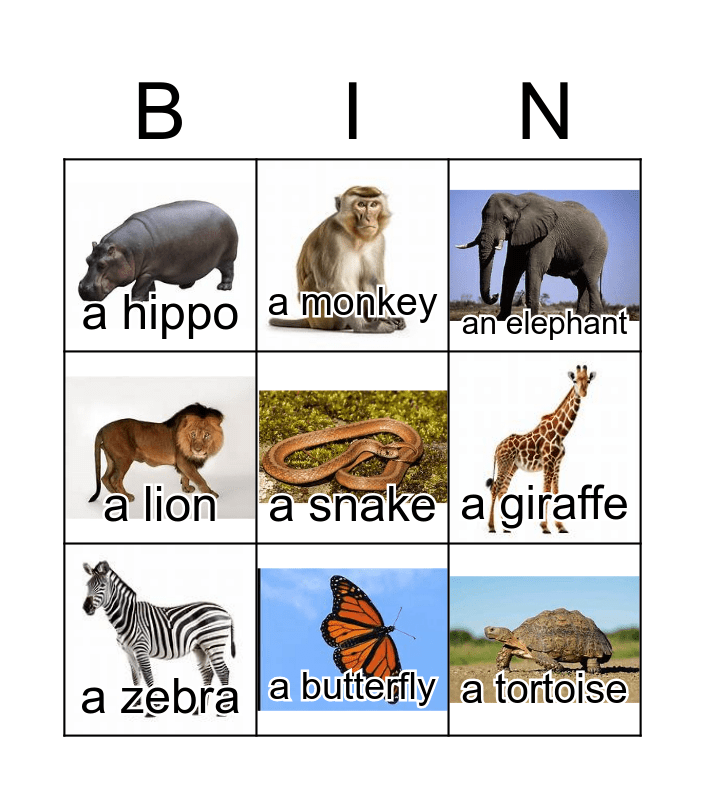This bingo card has 9 images, a free space and 9 words: a zebra, an elephant, a monkey, a lion, a hippo, a giraffe, a tortoise, a spider and a butterfly.