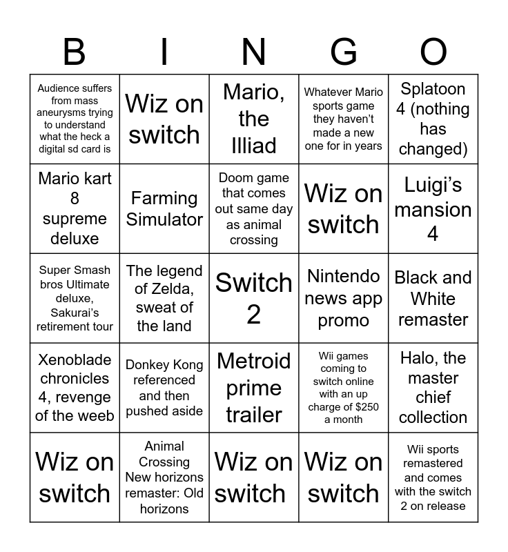 This bingo card has a free space and 24 words: Donkey Kong referenced and then pushed aside, Animal Crossing New horizons remaster: Old horizons, Doom game that comes out same day as animal crossing, Wiz on switch, Splatoon 4 (nothing has changed), Audience suffers from mass aneurysms trying to understand what the heck a digital sd card is, Mario kart 8 supreme deluxe, Wiz on switch, Nintendo news app promo, Metroid prime trailer, Wiz on switch, Super Smash bros Ultimate deluxe, Sakurai’s retirement tour, Wii games coming to switch online with an up charge of $250 a month, Halo, the master chief collection, Farming Simulator, Wiz on switch, Black and White remaster, Mario, the Illiad, Luigi’s mansion 4, The legend of Zelda, sweat of the land, Wii sports remastered and comes with the switch 2 on release, Xenoblade chronicles 4, revenge of the weeb, Whatever Mario sports game they haven’t made a new one for in years and Wiz on switch.