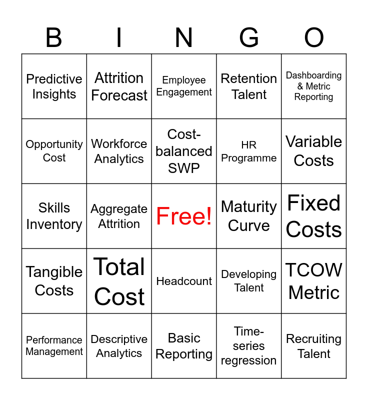 This bingo card has a free space and 24 words: Total Cost, Descriptive Analytics, Cost-balanced SWP, Performance Management, Dashboarding & Metric Reporting, Predictive Insights, Opportunity Cost, Attrition Forecast, Maturity Curve, Headcount, HR Programme, Skills Inventory, Developing Talent, TCOW Metric, Workforce Analytics, Time-series regression, Fixed Costs, Employee Engagement, Variable Costs, Aggregate Attrition, Recruiting Talent, Tangible Costs, Retention Talent and Basic Reporting.