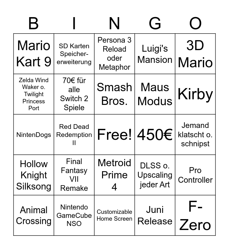 This bingo card has a free space and 24 words: Final Fantasy VII Remake, Nintendo GameCube NSO, Smash Bros., Animal Crossing, 3D Mario, Mario Kart 9, Zelda Wind Waker o. Twilight Princess Port, SD Karten Speicher- erweiterung, 450€, Metroid Prime 4, Maus Modus, NintenDogs, DLSS o. Upscaling jeder Art, Pro Controller, 70€ für alle Switch 2 Spiele, Juni Release, Jemand klatscht o. schnipst, Persona 3 Reload oder Metaphor, Kirby, Red Dead Redemption II, F-Zero, Hollow Knight Silksong, Luigi's Mansion and Customizable Home Screen.