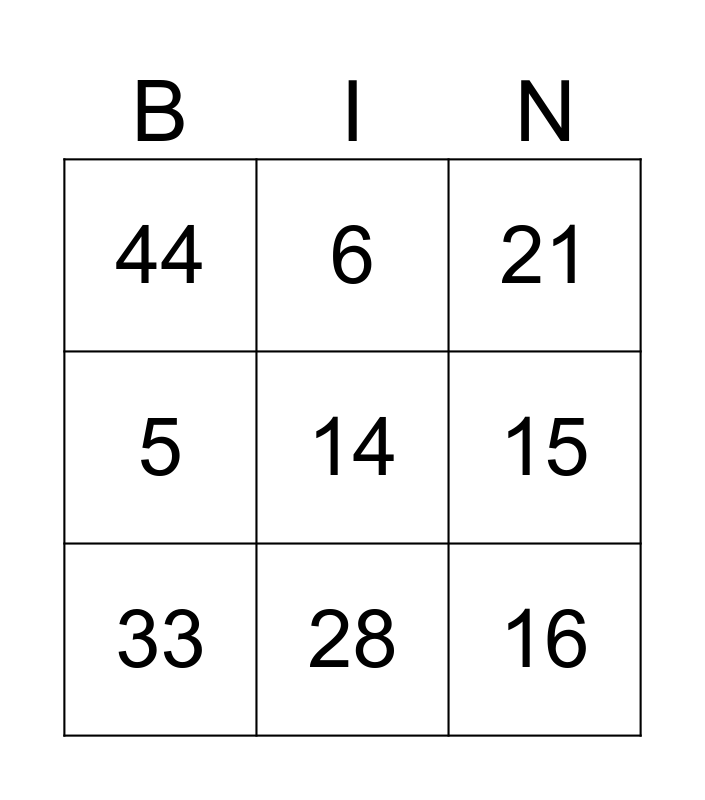 This bingo card has a free space and 8 words: 15, 21, 6, 33, 44, 16, 5 and 28.