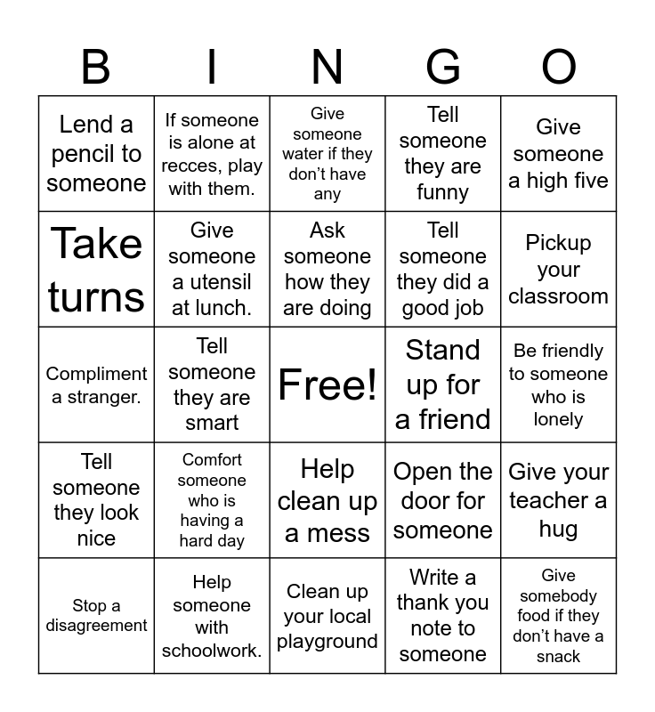 This bingo card has a free space and 41 words: Open the door for someone., Compliment a stranger., Say hi to the first person you see., Give someone a utensil at lunch., Help someone with schoolwork., Help clean up a mess, Ask someone how they are doing, Smile at someone, Give someone a high five, Tell someone they look nice, Tell someone they are smart, Tell someone they are funny, Give somebody food if they don’t have a snack, Be friendly to someone who is lonely, Stand up for a friend, Comfort someone who is having a hard day, Sit with someone who is alone at lunch, Lend a pencil to someone, Send a nice note to someone, Give someone water if they don’t have any, Give your teacher a hug, Say good morning to your classmates, Clean up your local playground, Tell someone they did a good job, Pick up a piece of trash, Tell someone you appreciate them, Write a thank you note to someone, Donate old clothes or toys, Pickup your classroom, Push in someone’s chair, Tell someone a joke, If someone is alone at recces, play with them., Stop a disagreement, Share a toy, Open the door for someone, Take turns, Apologize to someone, Help your teacher, Draw someone a picture, Help with a chore and Read to someone.