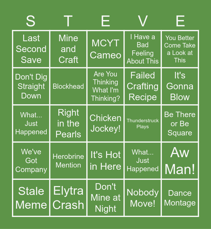 This bingo card has a free space and 24 words: Herobrine Mention, Elytra Crash, Are You Thinking What I'm Thinking?, Stale Meme, You Better Come Take a Look at This, Last Second Save, Don't Dig Straight Down, Mine and Craft, Thunderstruck Plays, It's Hot in Here, Failed Crafting Recipe, What... Just Happened, What... Just Happened, Aw Man!, Blockhead, Nobody Move!, Be There or Be Square, MCYT Cameo, It's Gonna Blow, Right in the Pearls, Dance Montage, We've Got Company, I Have a Bad Feeling About This and Don't Mine at Night.