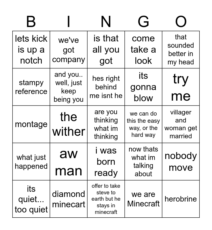 This bingo card has a free space and 24 words: aw man, diamond minecart, hes right behind me isnt he, its quiet... too quiet, that sounded better in my head, lets kick is up a notch, stampy reference, we've got company, we can do this the easy way, or the hard way, i was born ready, its gonna blow, montage, now thats what im talking about, nobody move, and you.. well, just keep being you, we are Minecraft, villager and woman get married, is that all you got, try me, the wither, herobrine, what just happened, come take a look and offer to take steve to earth but he stays in minecraft.