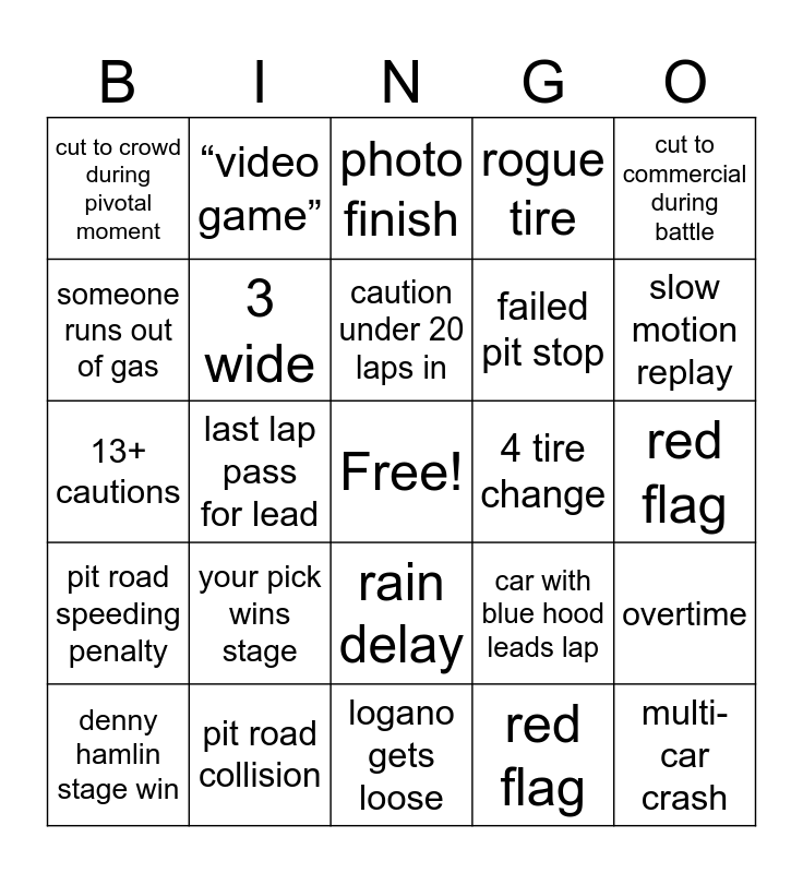 This bingo card has a free space and 38 words: crank it up, large hammer used for body repairs, “hail melon”, 3 wide, overtime, your pick wins stage, caution under 20 laps in, last lap caution, cut to commercial during battle, failed pit stop, last lap pass for lead, rogue tire, multi-car crash, red flag, someone runs out of gas, pit road speeding penalty, michael jordan, photo finish, gen z slang, 4 tire change, cut to crowd during pivotal moment, pit road collision, slow motion replay, denny hamlin stage win, “paperclip”, logano gets loose, chase elliott wins race, career-first win, “hot dogs”, jeff gordon, bowman and byron get into each other, rain delay, red flag, “video game”, “comers and goers”, car with blue hood leads lap, 13+ cautions and fist fight/confrontation.