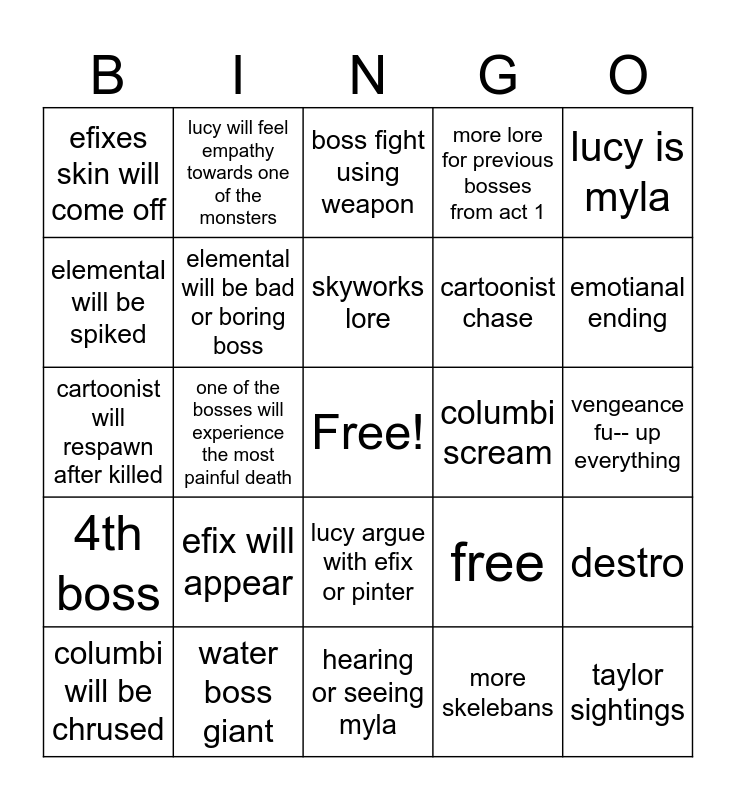 This bingo card has a free space and 29 words: columbi will be chrused, free, one of the bosses will experience the most painful death, aes or spring boss, efixes skin will come off, boss fight using weapon, elemental will be bad or boring boss, efix will appear, columbi scream, water boss giant, vengeance fu-- up everything, taylor sightings, hearing or seeing myla, more skelebans, emotianal ending, columbi best boss, lucy argue with efix or pinter, 4th boss, lucy is myla, cartoonist will respawn after killed, free, cliffhanger ending, cartoonist chase, elemental will be spiked, more lore for previous bosses from act 1, lucy will feel empathy towards one of the monsters, destro, skyworks lore and lucy will not feel empathy towards one of the monsters.