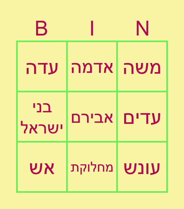 This bingo card has 20 words: Free!, קורח, משה, אהרון, דתן, אבירם, מרד, עדה, עונש, אדמה, כוהן, פרנסה, עדים, חטא, אש, הקרבה, מחלוקת, בני ישראל, הפסד and כבוד.
