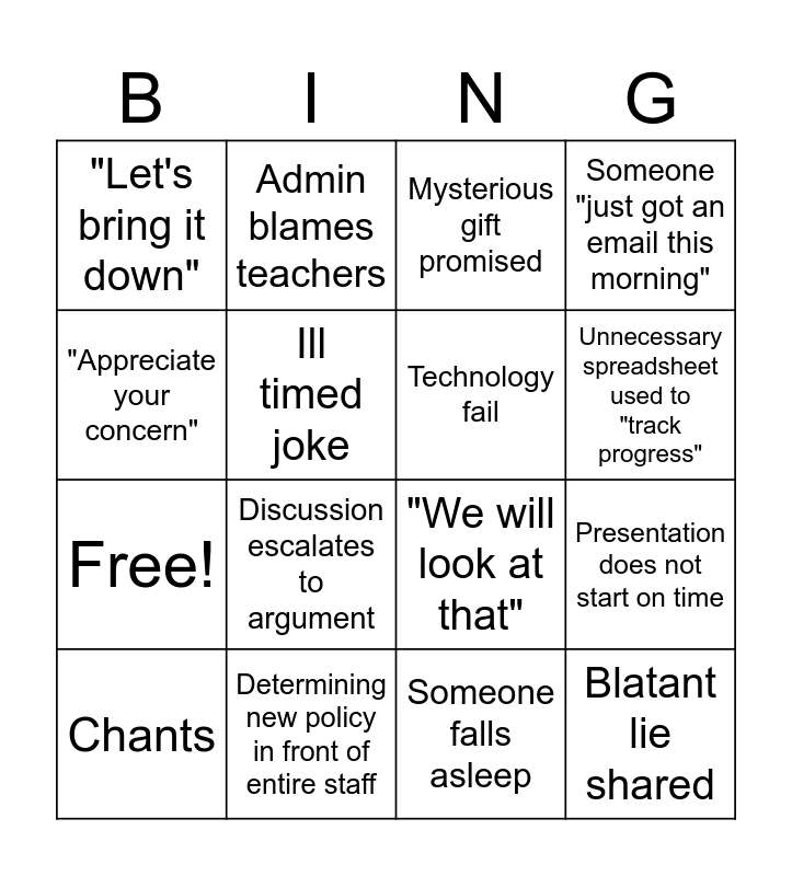 This bingo card has 20 words: Presentation does not start on time, Agenda is missing key information or not shared, Mysterious gift promised, Violation of a student privacy, Chants, "Appreciate your concern", Determining new policy in front of entire staff, "Let's bring it down", Free!, Admin blames teachers, Discussion escalates to argument, "We will look at that", Ill timed joke, Blatant lie shared, Technology fail, Discrepancy in data, Unnecessary spreadsheet used to "track progress", Someone "just got an email this morning", Someone falls asleep and Awkward game.