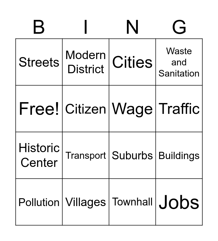 This bingo card has 16 words: Villages, Buildings, Cities, Streets, Historic Center, Modern District, Suburbs, Townhall, Free!, Citizen, Pollution, Waste and Sanitation, Transport, Traffic, Wage and Jobs.