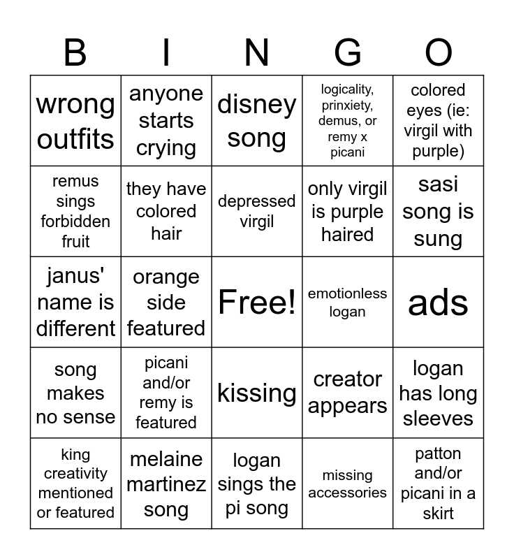 This bingo card has a free space and 49 words: logan doesnt have a tie, patton and/or picani in a skirt, logan, picani, or patton without glasses, logan sings the pi song, picani and/or remy is featured, made before POF, anyone starts crying, blond patton, remus sings forbidden fruit, thomas is featured, they have colored hair, logicality, prinxiety, demus, or remy x picani, logan has long sleeves, creator appears, over-accessorized, deceit is spelt wrong, depressed virgil, emotionless logan, virgil in a skirt or somehow infantilized, colored eyes (ie: virgil with purple), orange side featured, missing accessories, wrong outfits, only virgil is purple haired, paranoia and/or pride is featured, sasi song is sung, king creativity mentioned or featured, past v present, kissing, song makes no sense, darks v lights, no ships, ocs (ie: depression), player(s) predict, melaine martinez song, abusive janus, ships that arent the default, remus as a tw, ads, unrecognizable Sides, other fandoms included, actually decent, someone SH’S for some reason, songs listed in description, janus' name is different, disney song, 25+ minutes long, multiple parts and gay/lgbtq as a warning.