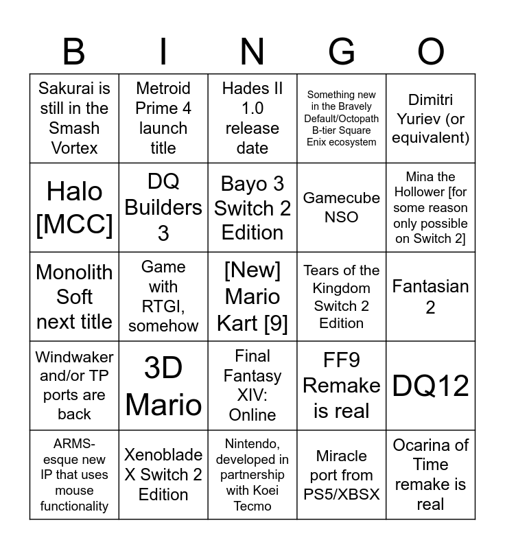 This bingo card has a free space and 24 words: 3D Mario, Xenoblade X Switch 2 Edition, Bayo 3 Switch 2 Edition, ARMS-esque new IP that uses mouse functionality, Dimitri Yuriev (or equivalent), Sakurai is still in the Smash Vortex, Halo [MCC], Metroid Prime 4 launch title, Tears of the Kingdom Switch 2 Edition, Final Fantasy XIV: Online, Gamecube NSO, Monolith Soft next title, FF9 Remake is real, DQ12, DQ Builders 3, Miracle port from PS5/XBSX, Fantasian 2, Hades II 1.0 release date, Mina the Hollower [for some reason only possible on Switch 2], Game with RTGI, somehow, Ocarina of Time remake is real, Windwaker and/or TP ports are back, Something new in the Bravely Default/Octopath B-tier Square Enix ecosystem and Nintendo, developed in partnership with Koei Tecmo.