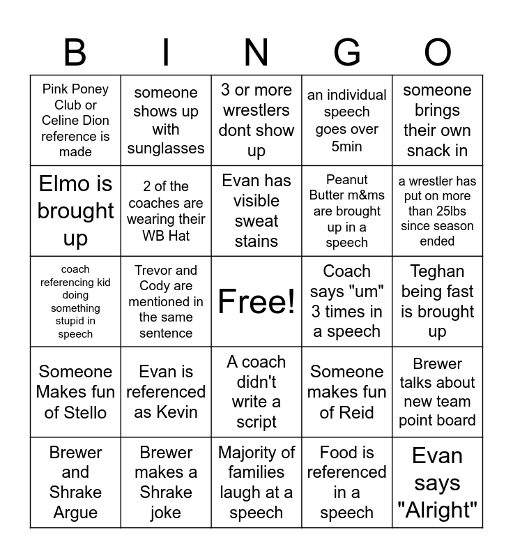 This bingo card has a free space and 45 words: Lodi is Mentioned, Evan says "Alright", A coach lets a swear word slip, Brewer and Shrake Argue, The new takedown rule is brought up, Food is referenced in a speech, 3 or more wrestlers dont show up, a wrestler walks in late, someone brings their own snack in, Brewer makes a Shrake joke, an individual speech goes over 5min, Coach says "um" 3 times in a speech, A coach didn't write a script, Evan is referenced as Kevin, Hess mentions killing someone, Majority of families laugh at a speech, Injuries are brought up in a speech, coach referencing kid doing something stupid in speech, Athlete wanting to quit is brought up, a wrestler has put on more than 25lbs since season ended, someone shows up with sunglasses, A coach is wearing joggers or shorts, Tears are shed due to someones speech, Pink Poney Club or Celine Dion reference is made, The speaker situation is referenced, Teghan being fast is brought up, Brewer glazes about takedowns, Brewer or Evan glazes about the amount of cradles, Someone makes fun of Reid, Someone Makes fun of Stello, Freestyle and Greco is brought up, Brewer talks about new team point board, Athlete barely making weight is brought up in a speech, coming in over-weight is mentioned in a speech, Miles wearing Teghan's shirt is mentioned, Trevor and Cody are mentioned in the same sentence, "Hook Em" is said, off-season camps are brought up, someone has to leave early, Evan has visible sweat stains, Elmo is brought up, Peanut Butter m&ms are brought up in a speech, Brewer referencing coaching one of the coaches, 2 of the coaches are wearing their WB Hat and One of the coaches is wearing a vest.