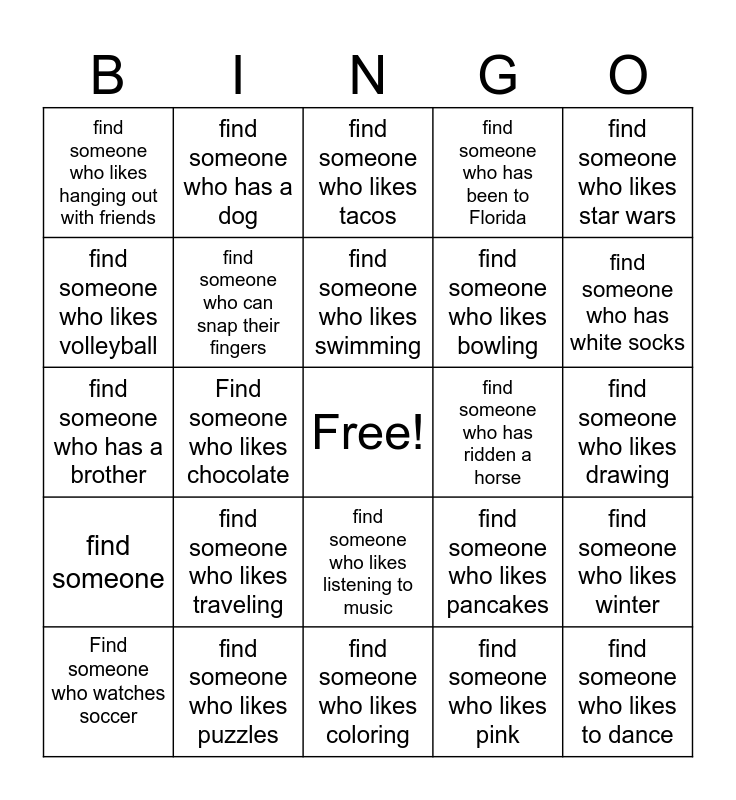 This bingo card has a free space and 29 words: Find someone who watches soccer, Find someone whos favorite animal is a dog, Find someone who likes chocolate, find someone who likes seafood, find someone who likes hanging out with friends, find someone who likes tacos, find someone who can snap their fingers, find someone who likes traveling, find someone who has ridden a horse, find someone who likes puzzles, find someone who likes drawing, find someone who likes to dance, find someone who likes coloring, find someone who likes pink, find someone who has white socks, find someone who likes reading, find someone who likes listening to music, find someone, find someone who likes star wars, find someone who has a brother, find someone who likes pancakes, find someone who has two sisters, find someone who likes bowling, find someone who likes volleyball, find someone who has been to Florida, find someone who has a dog, find someone who likes winter, find someone who likes swimming and find someone who likes sushi.