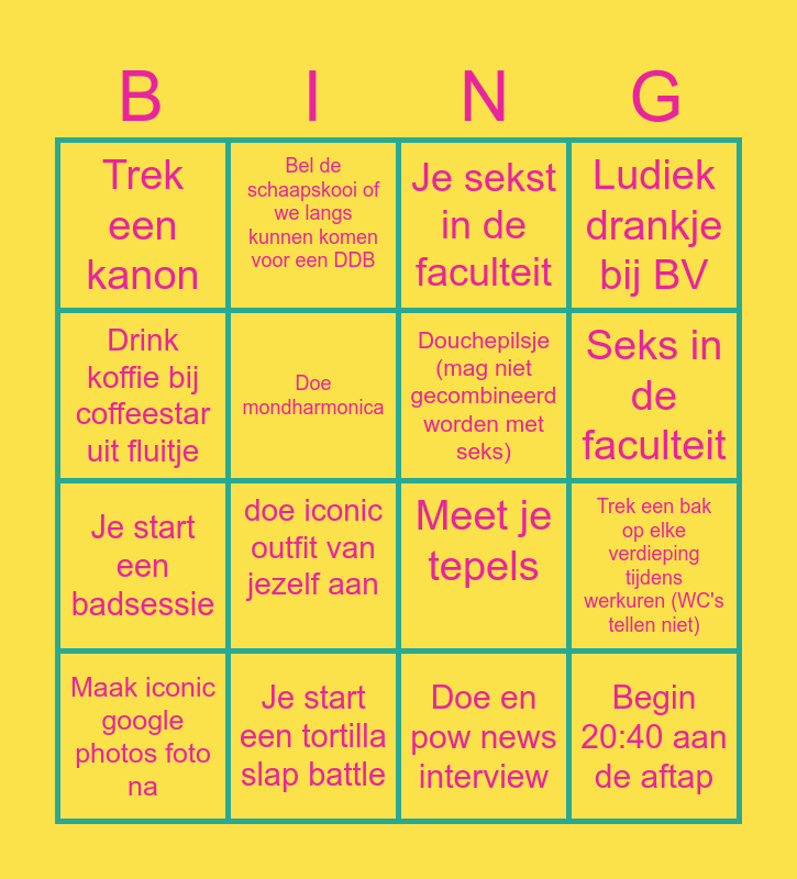 This bingo card has 16 words: Je start een tortilla slap battle, Trek een bak op elke verdieping tijdens werkuren (WC's tellen niet), Je sekst in de faculteit, Trek een kanon, Je start een badsessie, Bel de schaapskooi of we langs kunnen komen voor een DDB, Meet je tepels, Doe en pow news interview, Drink koffie bij coffeestar uit fluitje, Doe mondharmonica, Maak iconic google photos foto na, Ludiek drankje bij BV, doe iconic outfit van jezelf aan, Seks in de faculteit, Douchepilsje (mag niet gecombineerd worden met seks) and Begin 20:40 aan de aftap.