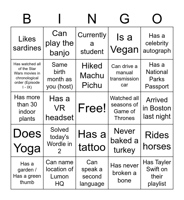 This bingo card has a free space and 29 words: Has a garden / Has a green thumb, Has zero social media accounts, Has a VR headset, Writes computer code, Likes sardines, Currently a student, Same birth month as you (host), Solved today's Wordle in 2, Watched all seasons of Game of Thrones, Can name location of Lumon HQ, Arrived in Boston last night, Has Tayler Swift on their playlist, Can speak a second language, Has never broken a bone, Has a National Parks Passport, Took dance lessons, Has a tattoo, Does Yoga, Has a celebrity autograph, Has more than 30 indoor plants, Never baked a turkey, Doesn't drink coffee, Can drive a manual transmission car, Has watched all of the Star Wars movies in chronological order (Episode I - IX), Is a Vegan, Can play the banjo, Rides horses, Hiked Machu Pichu and Can tie a bowline knot.