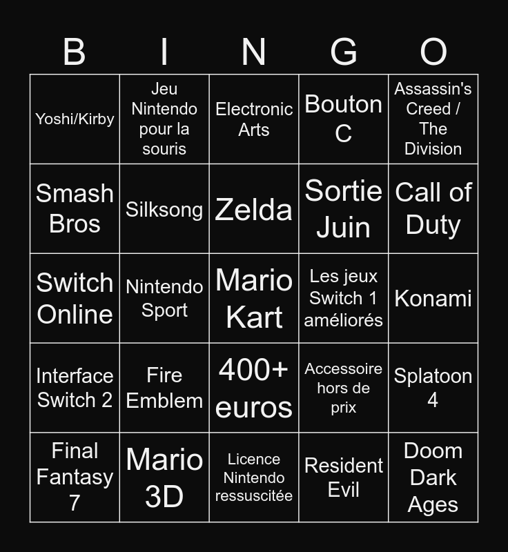 This bingo card has a free space and 24 words: Fire Emblem, Mario 3D, Zelda, Final Fantasy 7, Assassin's Creed / The Division, Yoshi/Kirby, Smash Bros, Jeu Nintendo pour la souris, Les jeux Switch 1 améliorés, 400+ euros, Sortie Juin, Switch Online, Accessoire hors de prix, Splatoon 4, Silksong, Resident Evil, Konami, Electronic Arts, Call of Duty, Nintendo Sport, Doom Dark Ages, Interface Switch 2, Bouton C and Licence Nintendo ressuscitée.