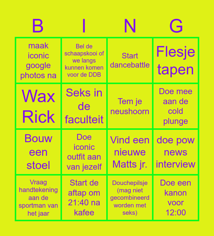 This bingo card has 16 words: Start de aftap om 21:40 na kafee, doe pow news interview, Start dancebattle, maak iconic google photos na, Bouw een stoel, Bel de schaapskooi of we langs kunnen komen voor de DDB, Vind een nieuwe Matts jr., Douchepilsje (mag niet gecombineerd worden met seks), Wax Rick, Seks in de faculteit, Vraag handtekening aan de sportman van het jaar, Flesje tapen, Doe iconic outfit aan van jezelf, Doe mee aan de cold plunge, Tem je neushoorn and Doe een kanon voor 12:00.