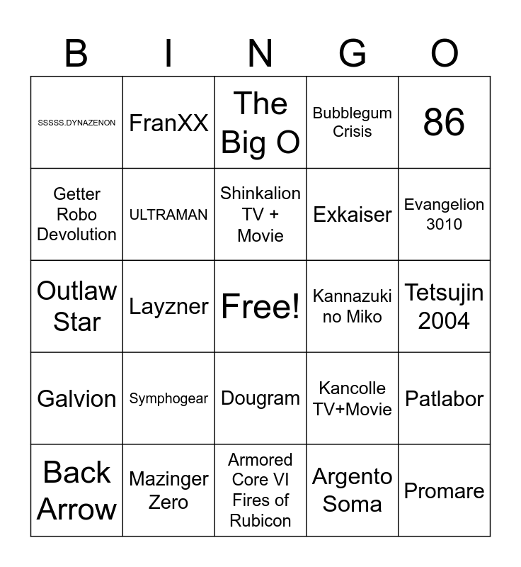 This bingo card has a free space and 24 words: Symphogear, Mazinger Zero, Shinkalion TV + Movie, Back Arrow, 86, SSSSS.DYNAZENON, Getter Robo Devolution, FranXX, Kannazuki no Miko, Dougram, Exkaiser, Outlaw Star, Kancolle TV+Movie, Patlabor, ULTRAMAN, Argento Soma, Tetsujin 2004, The Big O, Evangelion 3010, Layzner, Promare, Galvion, Bubblegum Crisis and Armored Core VI Fires of Rubicon.