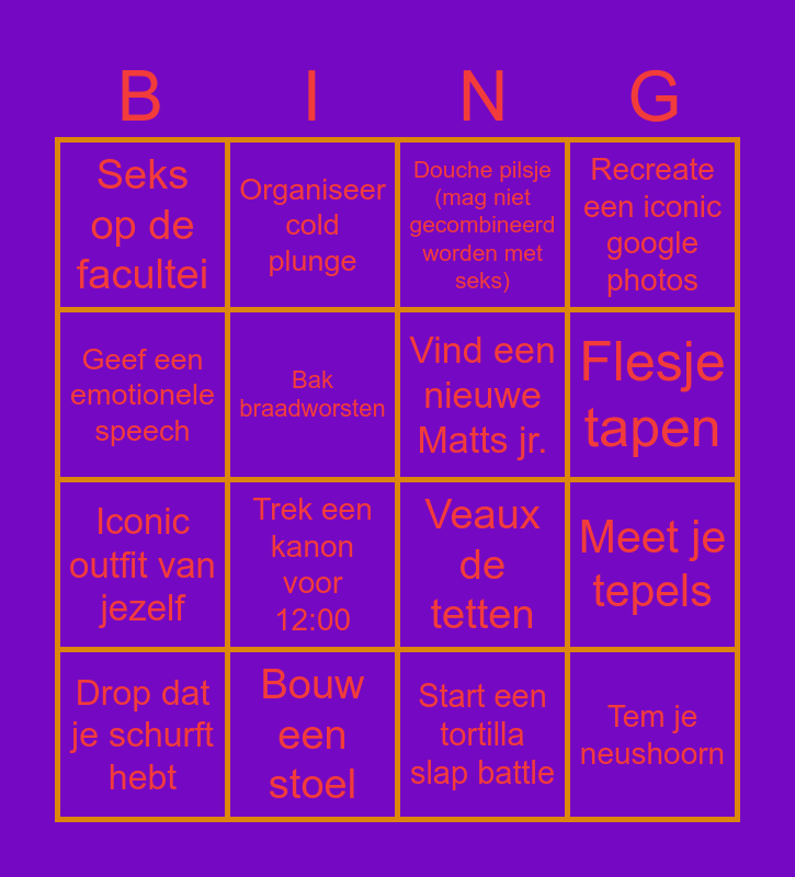 This bingo card has 16 words: Bouw een stoel, Meet je tepels, Douche pilsje (mag niet gecombineerd worden met seks), Seks op de facultei, Iconic outfit van jezelf, Organiseer cold plunge, Veaux de tetten, Start een tortilla slap battle, Geef een emotionele speech, Bak braadworsten, Drop dat je schurft hebt, Recreate een iconic google photos, Trek een kanon voor 12:00, Flesje tapen, Vind een nieuwe Matts jr. and Tem je neushoorn.