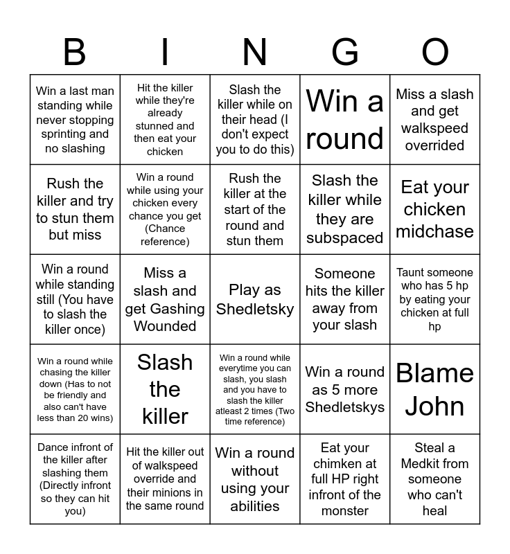 This bingo card has a free space and 24 words: Slash the killer, Hit the killer out of walkspeed override and their minions in the same round, Rush the killer at the start of the round and stun them, Dance infront of the killer after slashing them (Directly infront so they can hit you), Miss a slash and get walkspeed overrided, Win a last man standing while never stopping sprinting and no slashing, Rush the killer and try to stun them but miss, Hit the killer while they're already stunned and then eat your chicken, Someone hits the killer away from your slash, Win a round while everytime you can slash, you slash and you have to slash the killer atleast 2 times (Two time reference), Slash the killer while they are subspaced, Win a round while standing still (You have to slash the killer once), Win a round as 5 more Shedletskys, Blame John, Win a round while using your chicken every chance you get (Chance reference), Eat your chimken at full HP right infront of the monster, Taunt someone who has 5 hp by eating your chicken at full hp, Slash the killer while on their head (I don't expect you to do this), Eat your chicken midchase, Miss a slash and get Gashing Wounded, Steal a Medkit from someone who can't heal, Win a round while chasing the killer down (Has to not be friendly and also can't have less than 20 wins), Win a round and Win a round without using your abilities.