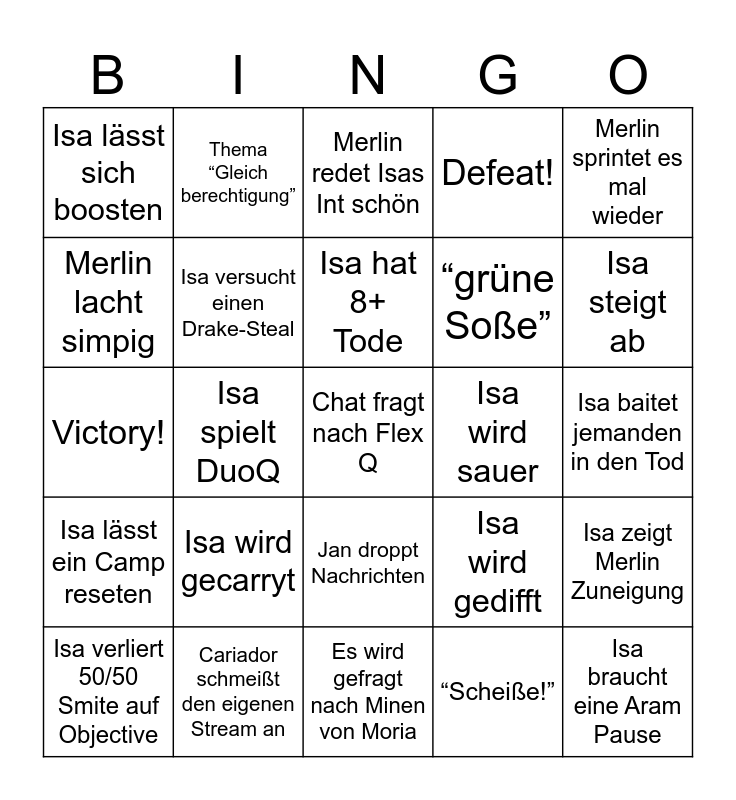 This bingo card has a free space and 24 words: Isa wird gecarryt, Cariador schmeißt den eigenen Stream an, Isa hat 8+ Tode, Isa verliert 50/50 Smite auf Objective, Merlin sprintet es mal wieder, Isa lässt sich boosten, Merlin lacht simpig, Thema “Gleich berechtigung”, Isa wird sauer, Jan droppt Nachrichten, “grüne Soße”, Victory!, Isa wird gedifft, Isa zeigt Merlin Zuneigung, Isa versucht einen Drake-Steal, “Scheiße!”, Isa baitet jemanden in den Tod, Merlin redet Isas Int schön, Isa steigt ab, Isa spielt DuoQ, Isa braucht eine Aram Pause, Isa lässt ein Camp reseten, Defeat! and Es wird gefragt nach Minen von Moria.