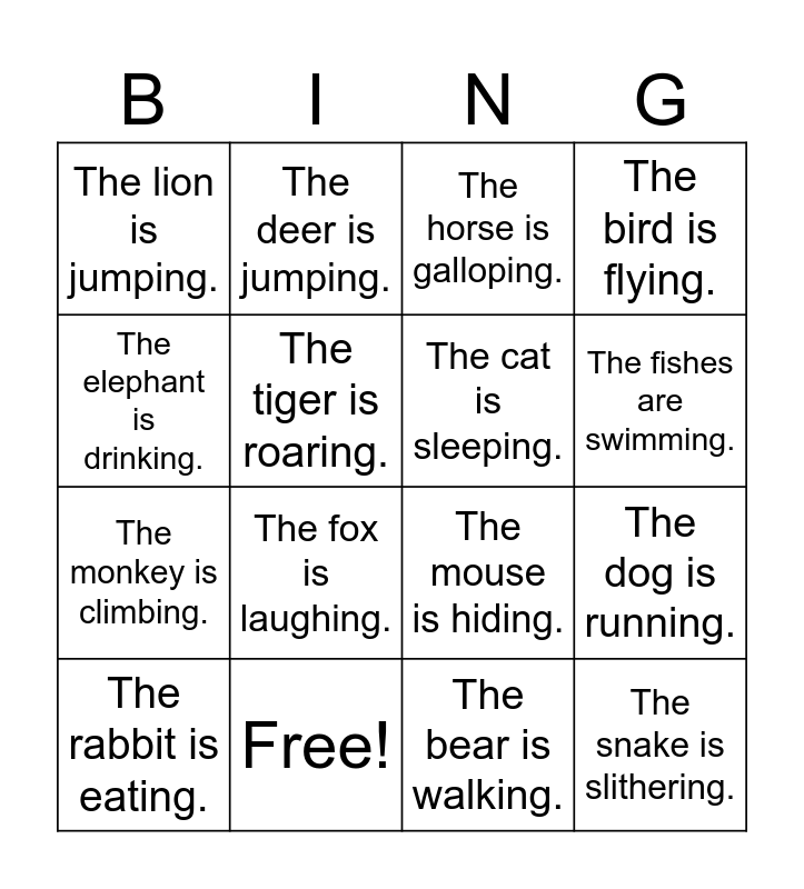 This bingo card has 16 words: Free!, The dog is running., The horse is galloping., The lion is jumping., The monkey is climbing., The deer is jumping., The mouse is hiding., The bear is walking., The elephant is drinking., The tiger is roaring., The rabbit is eating., The bird is flying., The fox is laughing., The fishes are swimming., The cat is sleeping. and The snake is slithering..