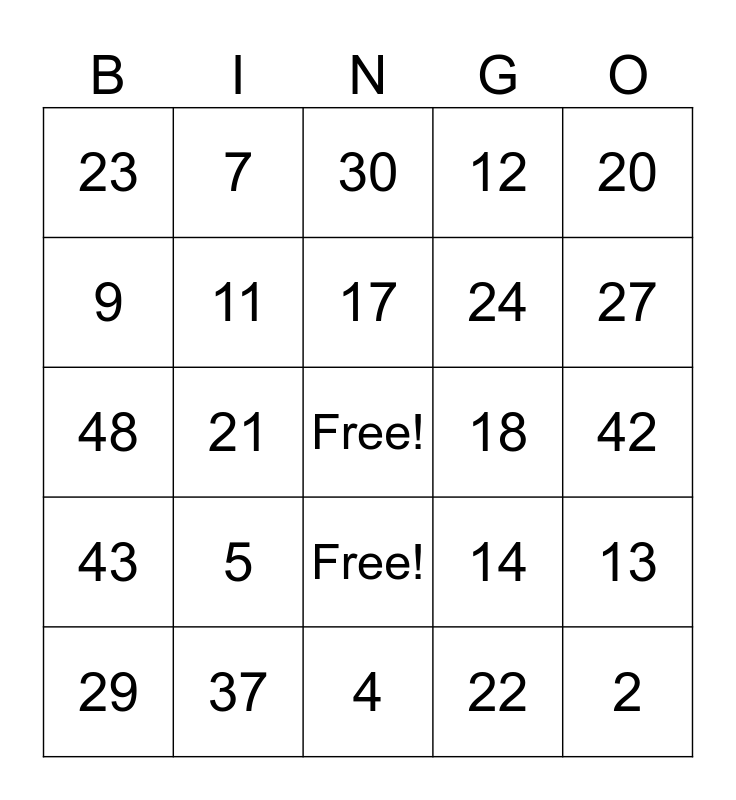 This bingo card has a free space and 51 words: 1, 2, 3, 4, 5, 6, 7, 8, 9, 10, 11, 12, 13, 14, 15, 16, 17, 18, 19, 20, 21, 22, 23, 24, 25, 26, 27, 28, 29, 30, 31, 32, 33, 35, 36, 37, 38, 39, 40, 41, 42, 43, 44, 45, 46, 47, 48, 49, 50, Free! and 0.
