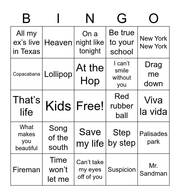 This bingo card has a free space and 24 words: Song of the south, Time won’t let me, At the Hop, Fireman, New York New York, All my ex’s live in Texas, Copacabana, Heaven, Red rubber ball, Save my life, I can’t smile without you, That’s life, Step by step, Palisades park, Lollipop, Suspicion, Viva la vida, On a night like tonight, Drag me down, Kids, Mr. Sandman, What makes you beautiful, Be true to your school and Can’t take my eyes off of you.