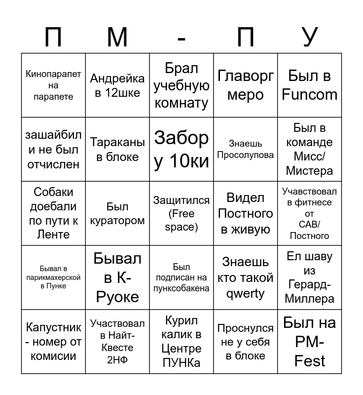This bingo card has a free space and 24 words: Бывал в К-Руоке, Участвовал в Найт-Квесте 2НФ, Забор у 10ки, Капустник - номер от комисии, Был в Funcom, Кинопарапет на парапете, зашайбил и не был отчислен, Андрейка в 12шке, Видел Постного в живую, Был подписан на пунксобакена, Знаешь Просолупова, Собаки доебали по пути к Ленте, Знаешь кто такой qwerty, Ел шаву из Герард-Миллера, Тараканы в блоке, Проснулся не у себя в блоке, Учавствовал в фитнесе от САВ/Постного, Брал учебную комнату, Был в команде Мисс/Мистера, Был куратором, Был на PM-Fest, Бывал в парикмахерской в Пунке, Главорг меро and Курил калик в Центре ПУНКа.