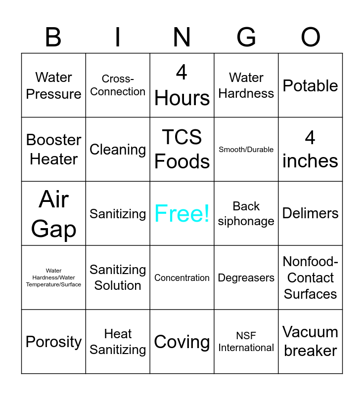 This bingo card has a free space and 29 words: Porosity, Resiliency, Coving, NSF International, Potable, Booster Heater, Cross-Connection, Backflow, Back siphonage, Vacuum breaker, Air Gap, Cleaning, Detergents, Degreasers, Delimers, Abrasive Cleaners, Sanitizing, Concentration, Water Hardness, Nonfood-Contact Surfaces, Water Hardness/Water Temperature/Surface, Heat Sanitizing, TCS Foods, Smooth/Durable, 4 inches, Water Pressure, Sanitizing Solution, 4 Hours and Remove food.