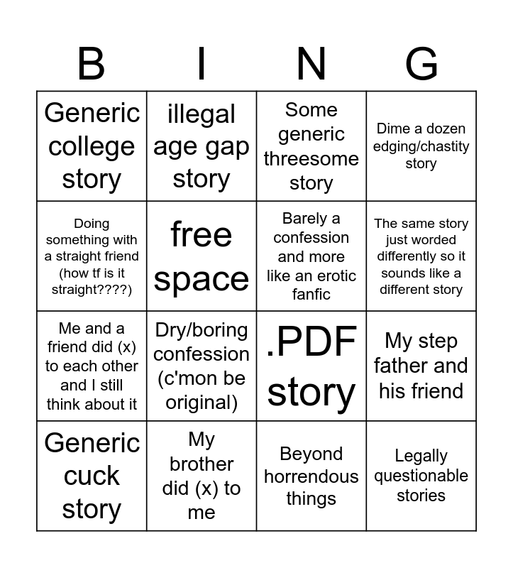 This bingo card has 16 words: My brother did (x) to me, My step father and his friend, Some generic threesome story, Generic college story, Me and a friend did (x) to each other and I still think about it, illegal age gap story, .PDF story, Beyond horrendous things, Doing something with a straight friend (how tf is it straight????), free space, Generic cuck story, Dime a dozen edging/chastity story, Dry/boring confession (c'mon be original), The same story just worded differently so it sounds like a different story, Barely a confession and more like an erotic fanfic and Legally questionable stories.