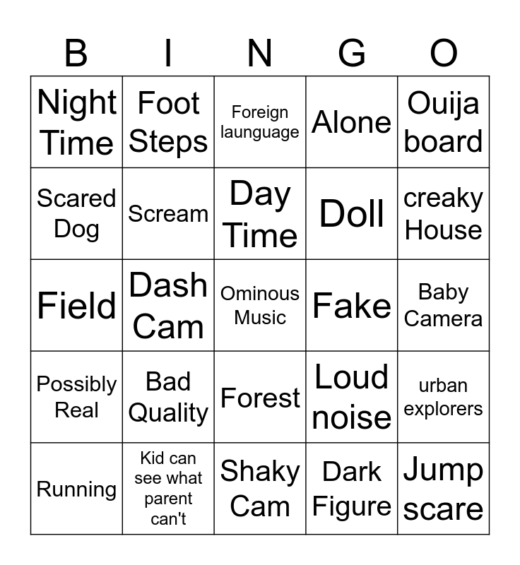 This bingo card has a free space and 24 words: Bad Quality, Kid can see what parent can't, Day Time, Running, Ouija board, Night Time, Scared Dog, Foot Steps, Fake, Forest, Doll, Field, Loud noise, urban explorers, Scream, Dark Figure, Baby Camera, Foreign launguage, creaky House, Dash Cam, Jump scare, Possibly Real, Alone and Shaky Cam.