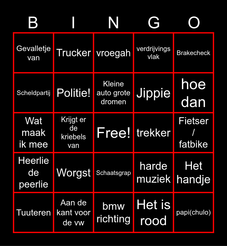 This bingo card has a free space and 24 words: Worgst, Aan de kant voor de vw, Kleine auto grote dromen, Tuuteren, Brakecheck, Gevalletje van, Scheldpartij, Trucker, trekker, Schaatsgrap, Jippie, Wat maak ik mee, harde muziek, Het handje, Politie!, Het is rood, Fietser / fatbike, vroegah, hoe dan, Krijgt er de kriebels van, papi(chulo), Heerlie de peerlie, verdrijvings vlak and bmw richting.