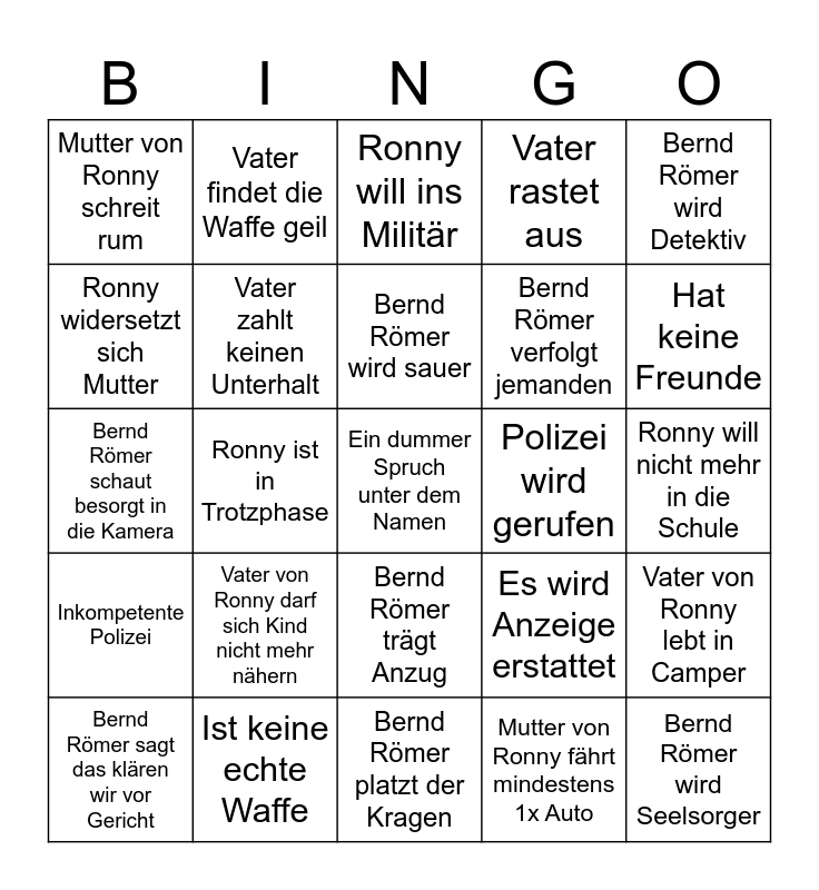 This bingo card has a free space and 24 words: Vater von Ronny darf sich Kind nicht mehr nähern, Ist keine echte Waffe, Bernd Römer wird sauer, Bernd Römer sagt das klären wir vor Gericht, Bernd Römer wird Detektiv, Mutter von Ronny schreit rum, Ronny widersetzt sich Mutter, Vater findet die Waffe geil, Polizei wird gerufen, Bernd Römer trägt Anzug, Bernd Römer verfolgt jemanden, Bernd Römer schaut besorgt in die Kamera, Es wird Anzeige erstattet, Vater von Ronny lebt in Camper, Vater zahlt keinen Unterhalt, Mutter von Ronny fährt mindestens 1x Auto, Ronny will nicht mehr in die Schule, Ronny will ins Militär, Hat keine Freunde, Ronny ist in Trotzphase, Bernd Römer wird Seelsorger, Inkompetente Polizei, Vater rastet aus and Bernd Römer platzt der Kragen.