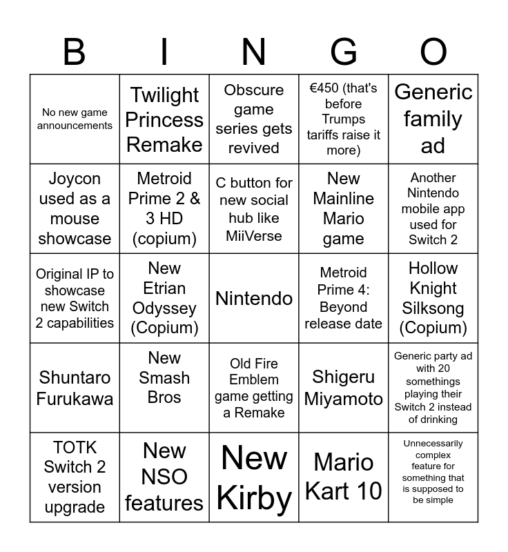 This bingo card has a free space and 24 words: New Smash Bros, New NSO features, C button for new social hub like MiiVerse, TOTK Switch 2 version upgrade, Generic family ad, No new game announcements, Joycon used as a mouse showcase, Twilight Princess Remake, Metroid Prime 4: Beyond release date, Old Fire Emblem game getting a Remake, New Mainline Mario game, Original IP to showcase new Switch 2 capabilities, Shigeru Miyamoto, Generic party ad with 20 somethings playing their Switch 2 instead of drinking, Metroid Prime 2 & 3 HD (copium), Mario Kart 10, Hollow Knight Silksong (Copium), Obscure game series gets revived, Another Nintendo mobile app used for Switch 2, New Etrian Odyssey (Copium), Unnecessarily complex feature for something that is supposed to be simple, Shuntaro Furukawa, €450 (that's before Trumps tariffs raise it more) and New Kirby.