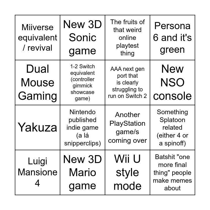 This bingo card has 16 words: New 3D Mario game, Something Splatoon related (either 4 or a spinoff), The fruits of that weird online playtest thing, Miiverse equivalent / revival, Yakuza, New 3D Sonic game, Another PlayStation game/s coming over, Wii U style mode, Dual Mouse Gaming, 1-2 Switch equivalent (controller gimmick showcase game), Luigi Mansione 4, Persona 6 and it's green, Nintendo published indie game (a lá snipperclips), New NSO console, AAA next gen port that is clearly struggling to run on Switch 2 and Batshit "one more final thing" people make memes about.