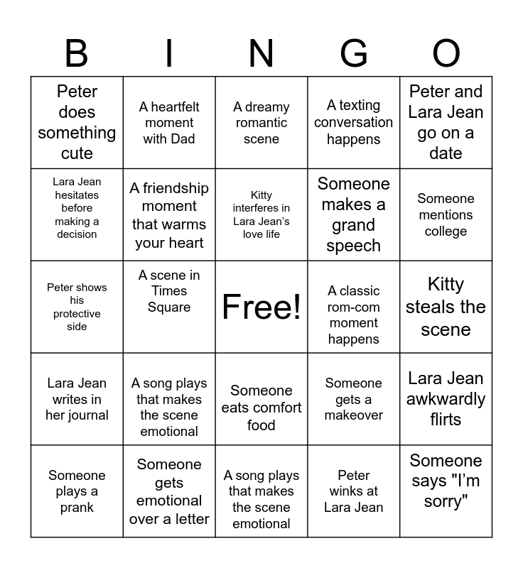 This bingo card has a free space and 24 words: A song plays that makes the scene emotional, Someone gets emotional over a letter, Kitty interferes in Lara Jean’s love life, Someone plays a prank, Peter and Lara Jean go on a date, Peter does something cute, Lara Jean hesitates before making a decision, A heartfelt moment with Dad, A classic rom-com moment happens, Someone eats comfort food, Someone makes a grand speech, Peter shows his protective side, Someone gets a makeover, Lara Jean awkwardly flirts, A friendship moment that warms your heart, Peter winks at Lara Jean, Kitty steals the scene, A dreamy romantic scene, Someone mentions college, A scene in Times Square, Someone says "I’m sorry", Lara Jean writes in her journal, A texting conversation happens and A song plays that makes the scene emotional.
