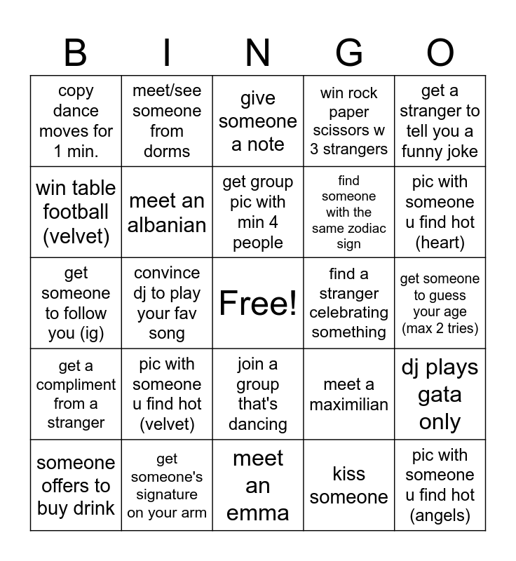 This bingo card has a free space and 24 words: pic with someone u find hot (velvet), get someone's signature on your arm, get group pic with min 4 people, someone offers to buy drink, get a stranger to tell you a funny joke, copy dance moves for 1 min., win table football (velvet), meet/see someone from dorms, find a stranger celebrating something, join a group that's dancing, find someone with the same zodiac sign, get someone to follow you (ig), meet a maximilian, dj plays gata only, meet an albanian, kiss someone, get someone to guess your age (max 2 tries), give someone a note, pic with someone u find hot (heart), convince dj to play your fav song, pic with someone u find hot (angels), get a compliment from a stranger, win rock paper scissors w 3 strangers and meet an emma.