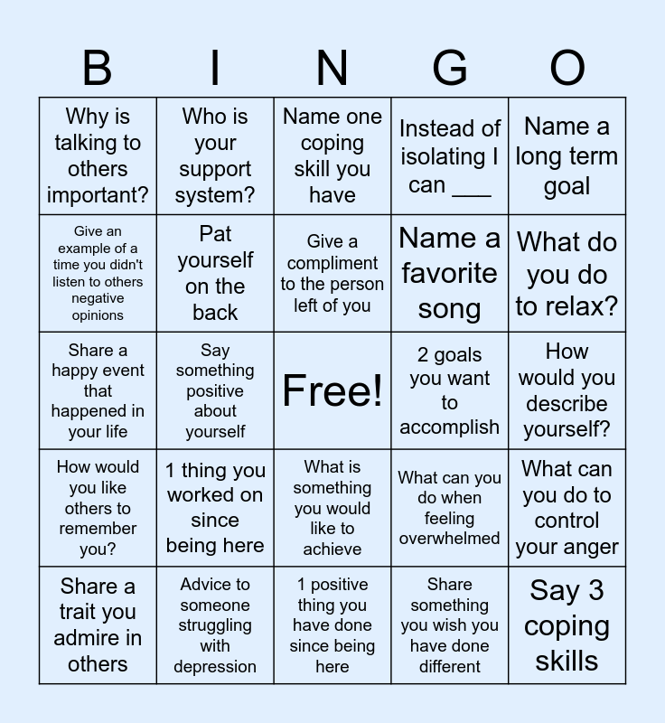 This bingo card has a free space and 32 words: Name two books you like to read, Advice to someone struggling with depression, 1 positive thing you have done since being here, When I am stressed ___ makes me better, What do you do to relax?, Why is talking to others important?, Say something positive about yourself, What is something you would like to achieve, Instead of isolating I can ___, Say 3 coping skills, Give an example of a time you didn't listen to others negative opinions, Who is your support system?, Share something you wish you have done different, How have you shown love to yourself, How would you like others to remember you?, Share a fun fact about yourself, Where is your happy place?, 2 goals you want to accomplish, How would you describe yourself?, Share a trait you admire in others, 1 thing you worked on since being here, I feel good about myself when ___, What can you do when feeling overwhelmed, What can you do to control your anger, Share a happy event that happened in your life, Pat yourself on the back, Name one coping skill you have, Name a favorite song, Name a long term goal, What are you grateful for?, Label your mood right now and Give a compliment to the person left of you.