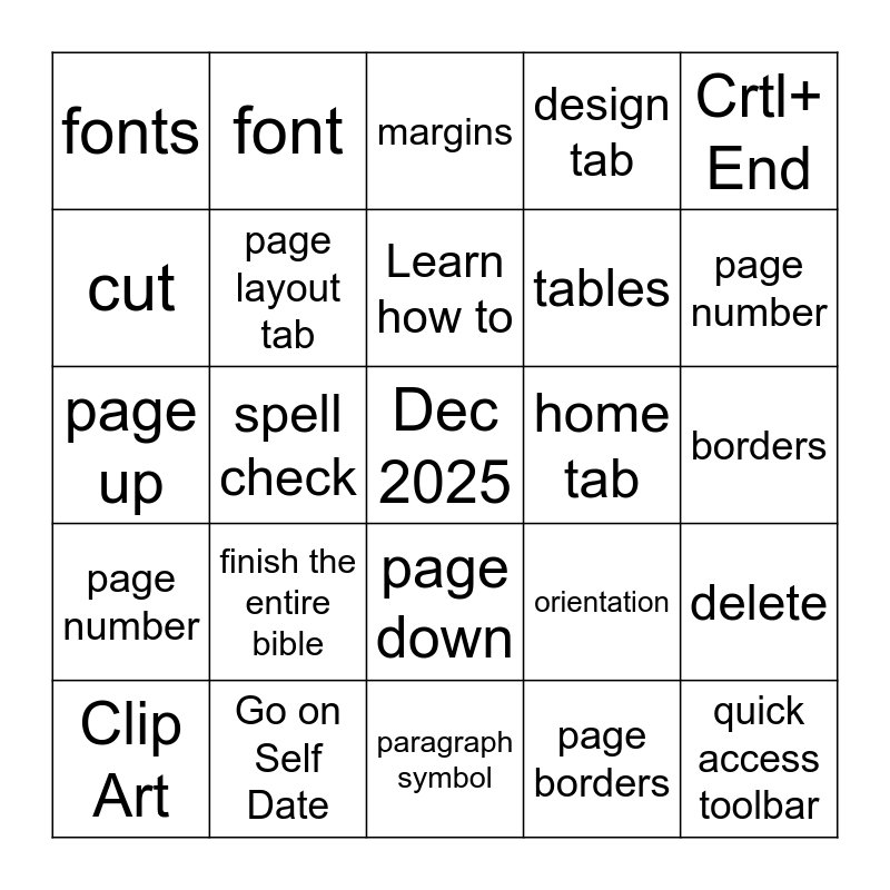 This bingo card has a free space and 24 words: finish the entire bible, Go on Self Date, Learn how to, Clip Art, Crtl+ End, fonts, cut, font, home tab, page down, tables, page up, orientation, delete, page layout tab, page borders, borders, margins, page number, spell check, quick access toolbar, page number, design tab and paragraph symbol.