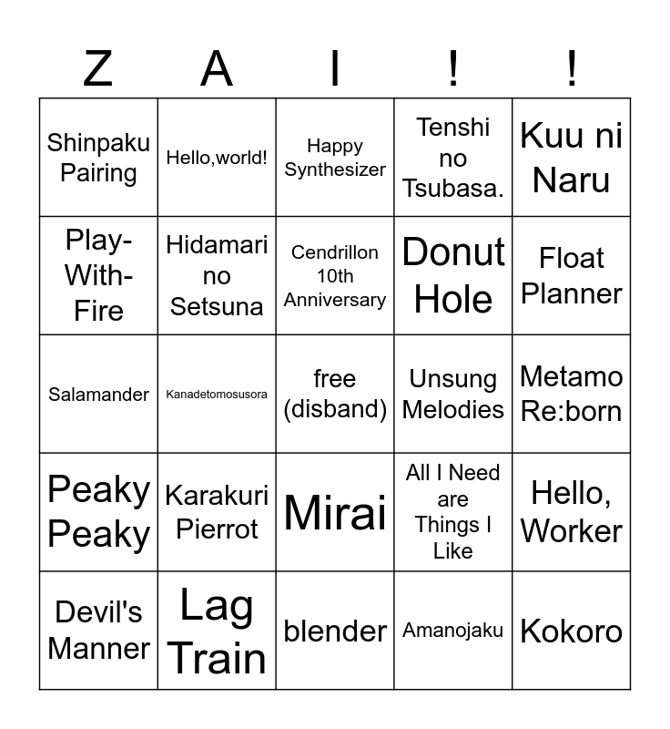 This bingo card has a free space and 24 words: Karakuri Pierrot, Lag Train, Cendrillon 10th Anniversary, Devil's Manner, Kuu ni Naru, Shinpaku Pairing, Play-With-Fire, Hello,world!, Unsung Melodies, Mirai, Donut Hole, Salamander, All I Need are Things I Like, Hello, Worker, Hidamari no Setsuna, Amanojaku, Metamo Re:born, Happy Synthesizer, Float Planner, Kanadetomosusora, Kokoro, Peaky Peaky, Tenshi no Tsubasa. and blender.