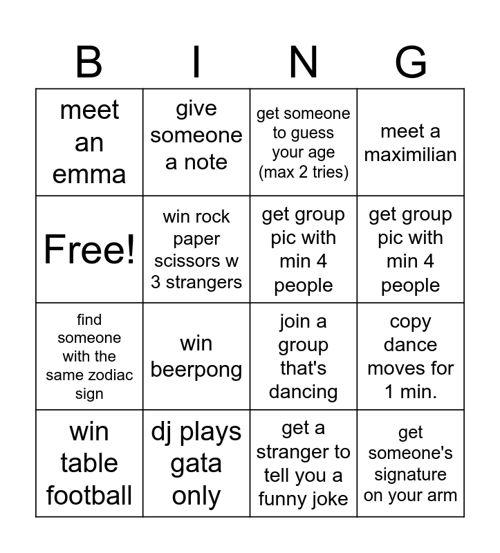 This bingo card has 16 words: dj plays gata only, copy dance moves for 1 min., get someone to guess your age (max 2 tries), meet an emma, find someone with the same zodiac sign, give someone a note, join a group that's dancing, get a stranger to tell you a funny joke, Free!, win rock paper scissors w 3 strangers, win table football, meet a maximilian, win beerpong, get group pic with min 4 people, get group pic with min 4 people and get someone's signature on your arm.