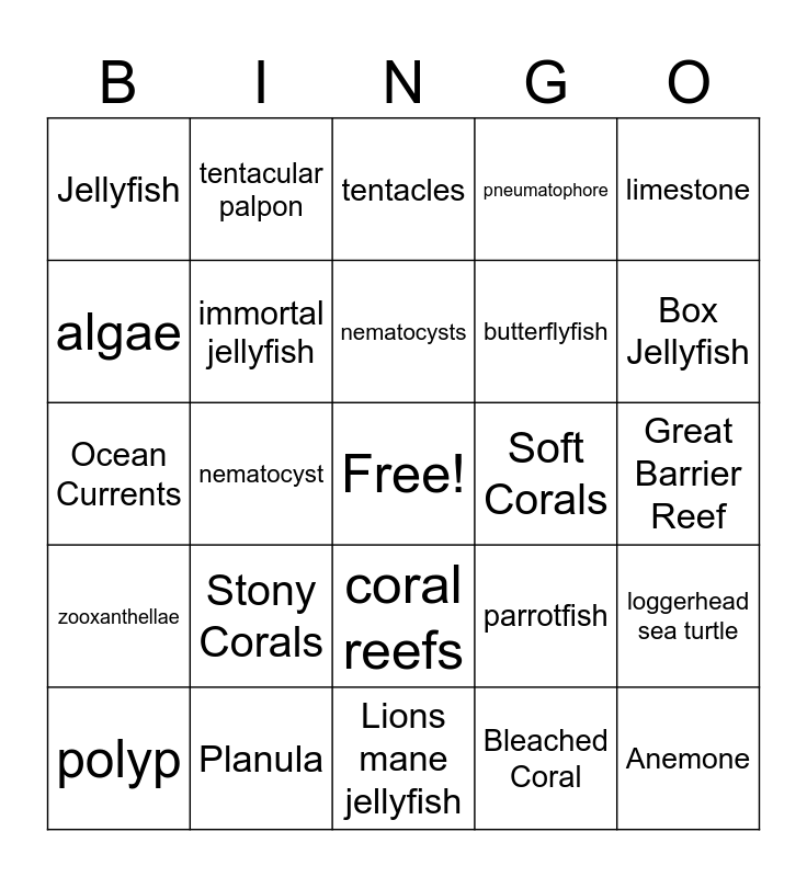 This bingo card has a free space and 29 words: polyp, MEDUSA, nematocyst, Man-of-war, Jellyfish, tentacles, immortal jellyfish, Stony Corals, Soft Corals, Planula, Great Barrier Reef, Anemone, Lions mane jellyfish, Bleached Coral, Box Jellyfish, siphonophore, coral reefs, zooxanthellae, limestone, Ocean Currents, parrotfish, Coral Skeletons, butterflyfish, algae, pneumatophore, tentacular palpon, loggerhead sea turtle, nematocysts and comb jelly.