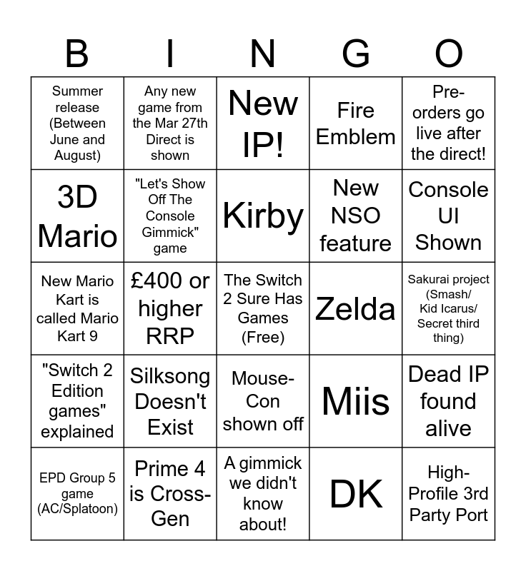 This bingo card has a free space and 24 words: Silksong Doesn't Exist, Prime 4 is Cross-Gen, Kirby, EPD Group 5 game (AC/Splatoon), Pre-orders go live after the direct!, Summer release (Between June and August), 3D Mario, Any new game from the Mar 27th Direct is shown, Zelda, Mouse-Con shown off, New NSO feature, New Mario Kart is called Mario Kart 9, Miis, Dead IP found alive, "Let's Show Off The Console Gimmick" game, DK, Sakurai project (Smash/ Kid Icarus/ Secret third thing), New IP!, Console UI Shown, £400 or higher RRP, High-Profile 3rd Party Port, "Switch 2 Edition games" explained, Fire Emblem and A gimmick we didn't know about!.