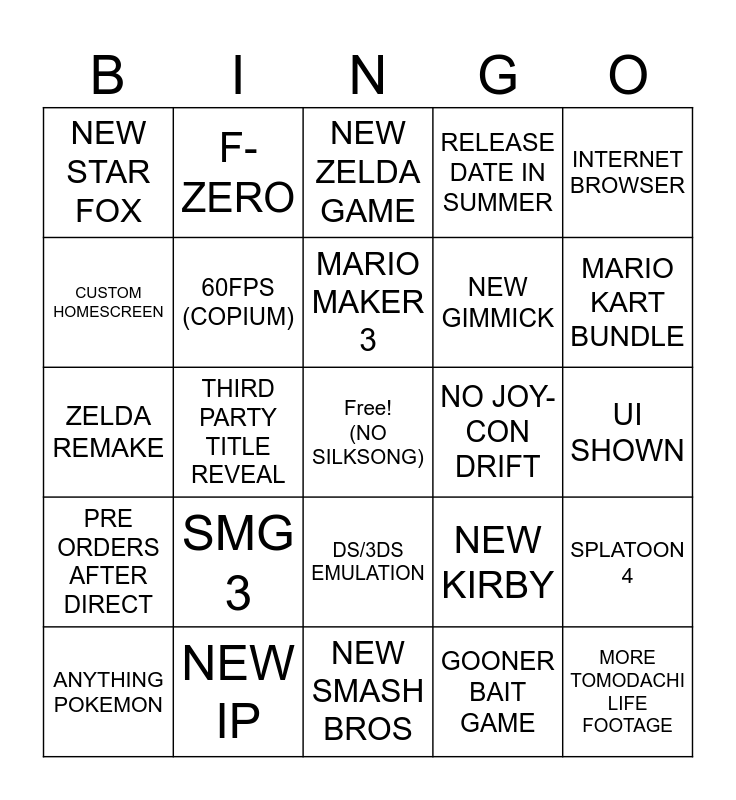 This bingo card has a free space and 24 words: SMG 3, NEW IP, MARIO MAKER 3, ANYTHING POKEMON, INTERNET BROWSER, NEW STAR FOX, CUSTOM HOMESCREEN, F-ZERO, NO JOY-CON DRIFT, DS/3DS EMULATION, NEW GIMMICK, ZELDA REMAKE, NEW KIRBY, SPLATOON 4, 60FPS (COPIUM), GOONER BAIT GAME, UI SHOWN, NEW ZELDA GAME, MARIO KART BUNDLE, THIRD PARTY TITLE REVEAL, MORE TOMODACHI LIFE FOOTAGE, PRE ORDERS AFTER DIRECT, RELEASE DATE IN SUMMER and NEW SMASH BROS.